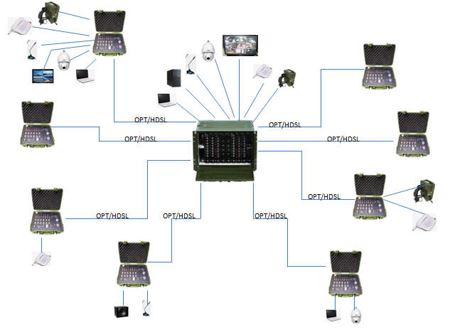 The vehicle-mounted emergency wired transmission integrated service system includes PT-50 VM7U field frame type equipment , analog junction box, digital junction box and remote PT-50 PU portable equipment, which are used for the connection between the command center and the outfield to complete the remote connection of audio and video, telephone, E1 and network, Realize localized program-controlled telephone self-organization network and access to superior switching network through digital trunk or analog trunk.The central office equipment has the command and dispatching functions of video matrix and conference telephone, and the remote equipment can communicate with each other. The command center shall conduct centralized management on the equipment in the outfield, and the optical fiber or field cable can be used for the connection. The equipment adopts the form of portable case, and the interior of the case adopts modular design. Different business cards can be configured according to different use requirements to meet the different usage scale of each business.